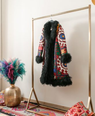 Composition: made of Uzbek traditional contemporary cotton suzani, fur trimmed (light grey color), with sheep wool lining (beige color)